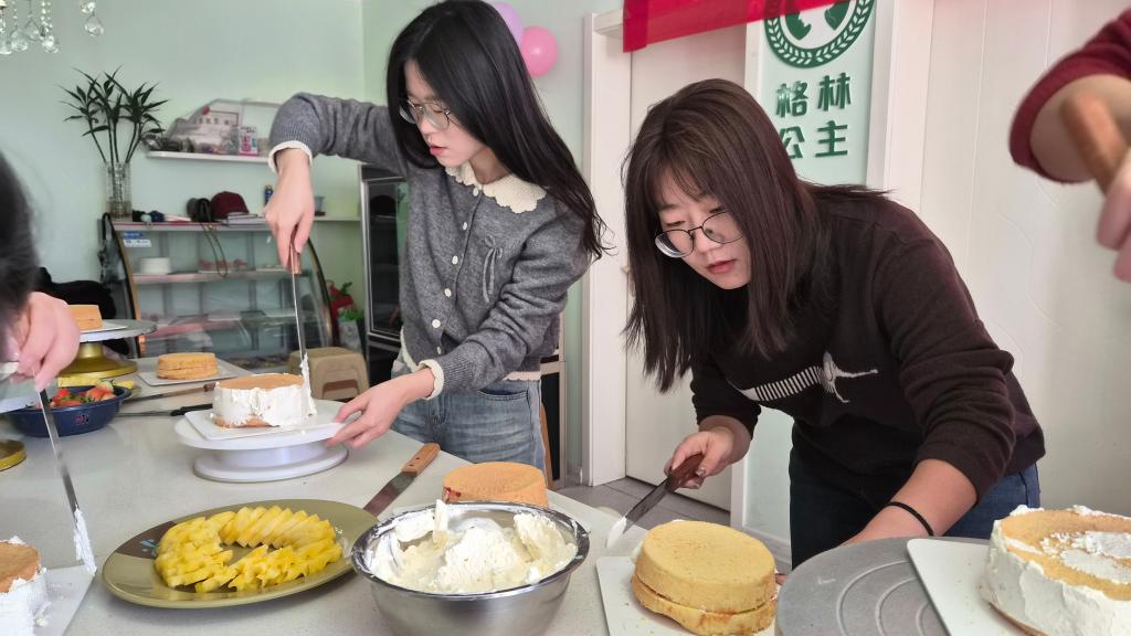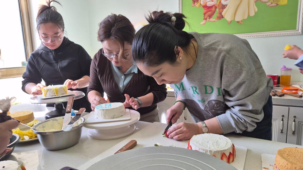 活动现场布置温馨,暖意融融、香气四溢,蛋糕胚、新鲜水果、香甜奶油、裱花工具等一应俱全。专业烘焙老师现场讲解制作要点,示范抹胚、裱花、装饰等技巧,耐心指导细节操作。女职工们踊跃参与,认真涂抹奶油、精心搭配水果、创意设计造型,大家相互交流、互帮互助,欢声笑语与奶油甜香交织成节日的乐章。在巧手创作与沉浸式体验中,一块块朴素的蛋糕胚变美观精致的专属蛋糕,每一件作品都承载着巧思与喜悦。大家手持成品拍照留念,在香甜的气息中放松心情、增进交流,度过了一段充实又温暖的美好时光。